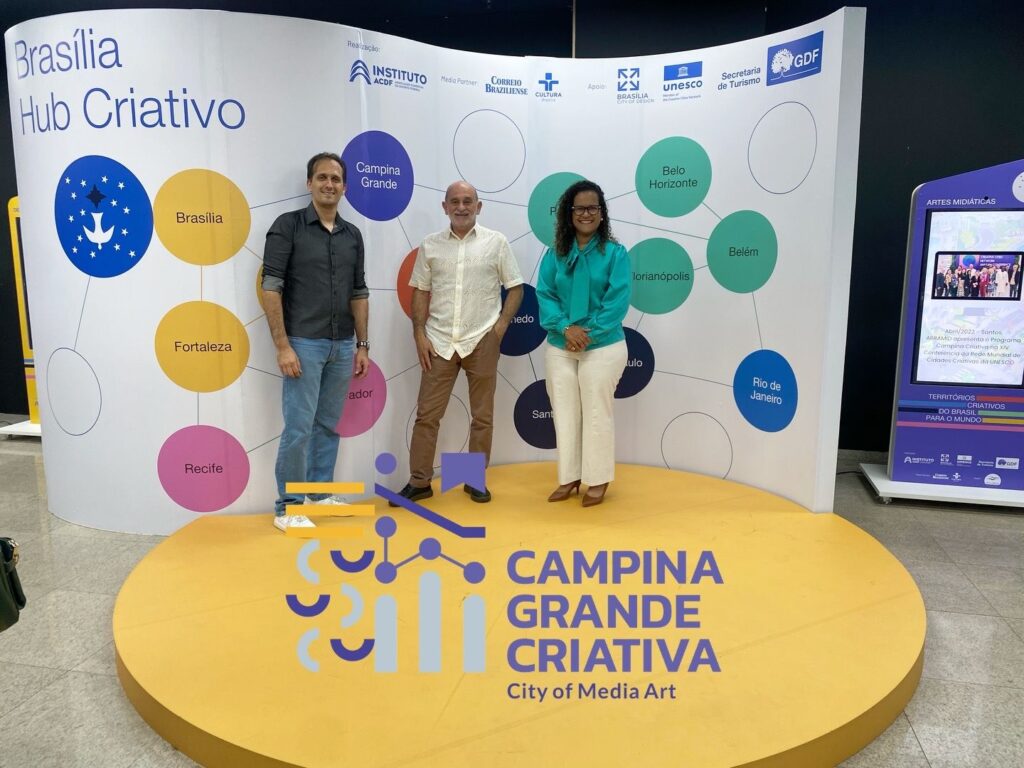 A delegação contou com a presença do professor Marcelo de Barros, coordenador nacional da Rede Brasileira de Cidades Criativas (RBCC); Flávio Brasil, diretor da ABRAMID – Associação Brasileira de Artes Midiáticas; e Julianna Dutra, gestora da Experaí Criativa, articuladora de comunicação do E.InovCG e diretora da Comissão do Selo Campina Grande Cidade Criativa.