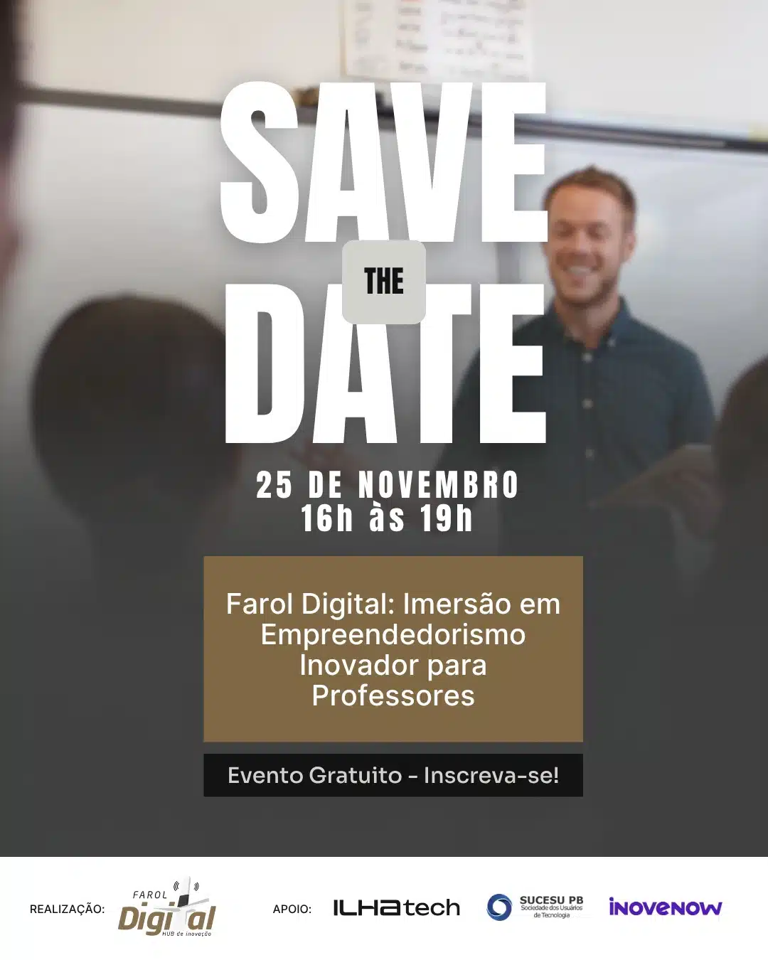 O Hub de inovação Farol Digital promove no próximo dia 25 de novembro de 2025, no Ilha Tech, em João Pessoa (PB), uma “Imersão em Empreendedorismo Inovador para Professores”, com o objetivo de capacitar educadores a inspirar seus alunos por meio de mentalidade empreendedora e inovação. A participação é gratuita, bastando realizar a inscrição por meio do site do evento.