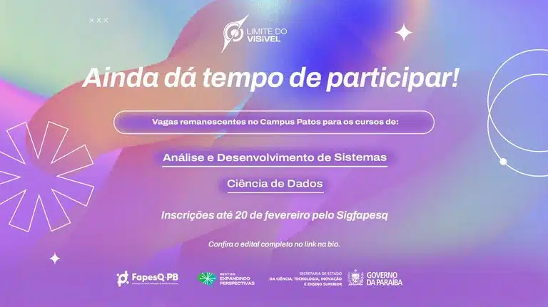 O Governo da Paraíba, por meio da Secretaria de Estado da Ciência, Tecnologia, Inovação e Ensino Superior (Secties), com apoio da Fundação de Apoio à Pesquisa do Estado da Paraíba (Fapesq), abriu inscrições para 65 vagas remanescentes em cursos gratuitos na área de tecnologia, por meio do Projeto Limite do Visível, no campus da Universidade Estadual da Paraíba (UEPB), em Patos.